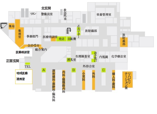 総合案内・受付・会計・外来診察室・救急外来・薬局・内視鏡室・生理検査室・化学療法室・リハビリテーション室(別棟)・放射線部門・地域医療連携室・医療相談室・栄養管理室・授乳室・売店・自販機機